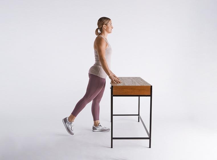- الطريقة: قف بشكل مستقيم، مع الاستناد إلى شيء كي لا تقع ، ثم ارفع الساق المصابة للخلف ببطء. كرّر 10 مرات